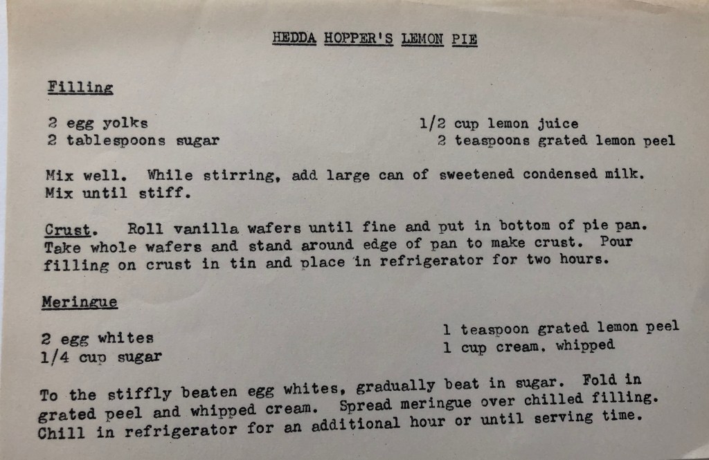 My mother was a good cook. I still have her three-ring binder busting with newspaper clippings of recipes, old cookbooks: The Art of Cooking and Serving by Sarah Field Splint, 1929 and educational booklets, such as The Herb-Ox Money Saver, 1949 and Sunkist Lemons: Bring Out the Flavor, 1939. Tucked into the pages of this last book is a typed recipe for Hedda Hopper’s Lemon Pie.