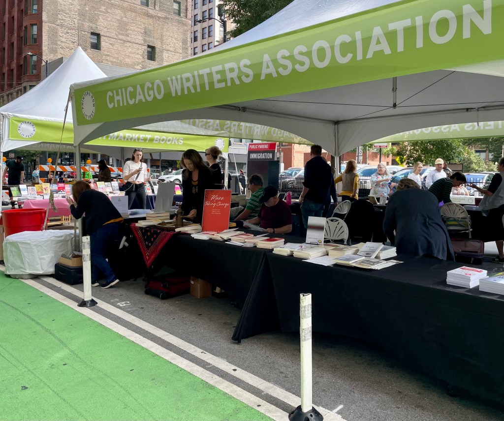 I pulled her suitcase with 20 books alongside the row of tents on Dearborn Avenue. The Chicago Writers Association had a tent where Lois had rented a spot that I would share with two other authors.