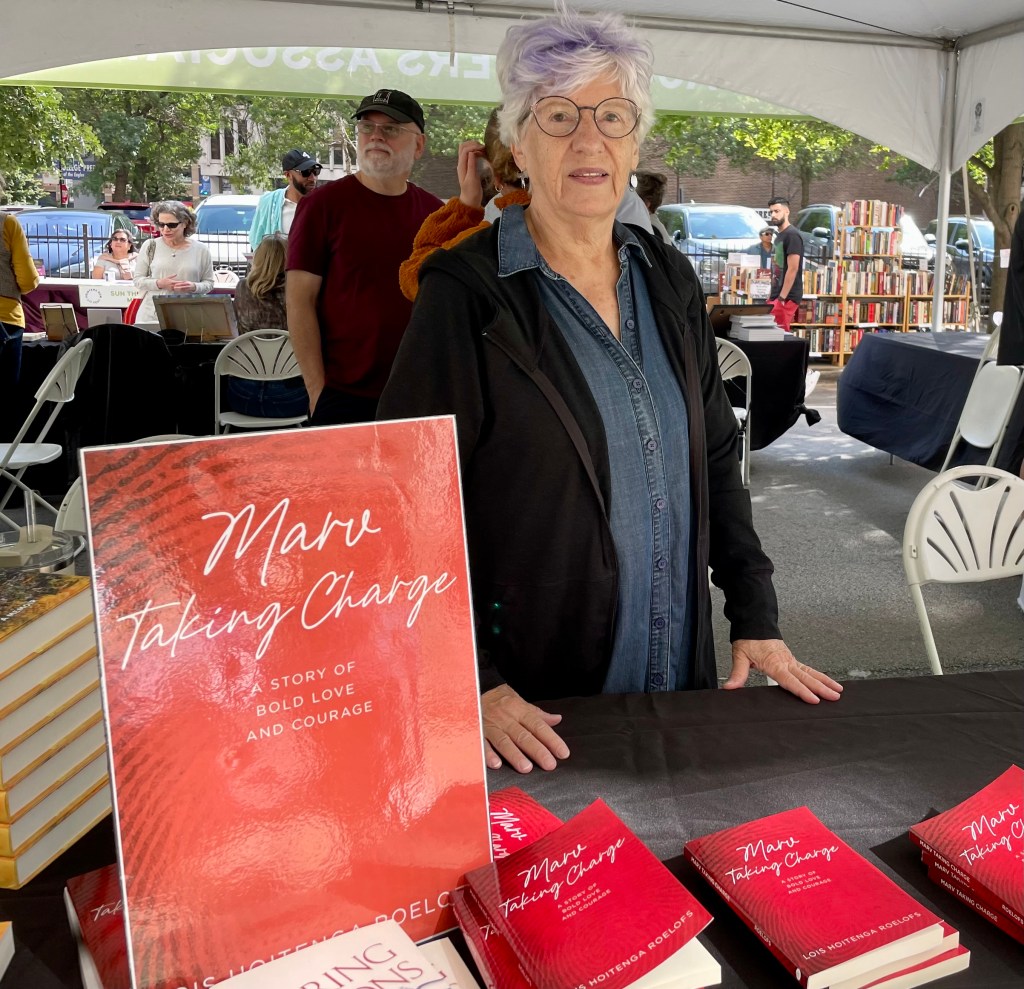 I’m selling Lois’ book, Marv Taking Charge, A Story of Bold Love and Courage, at Printers Row in Chicago. Lois couldn’t sell her own books because two days earlier, she tripped on an uneven sidewalk, and landed face down in the street, knocking herself out.