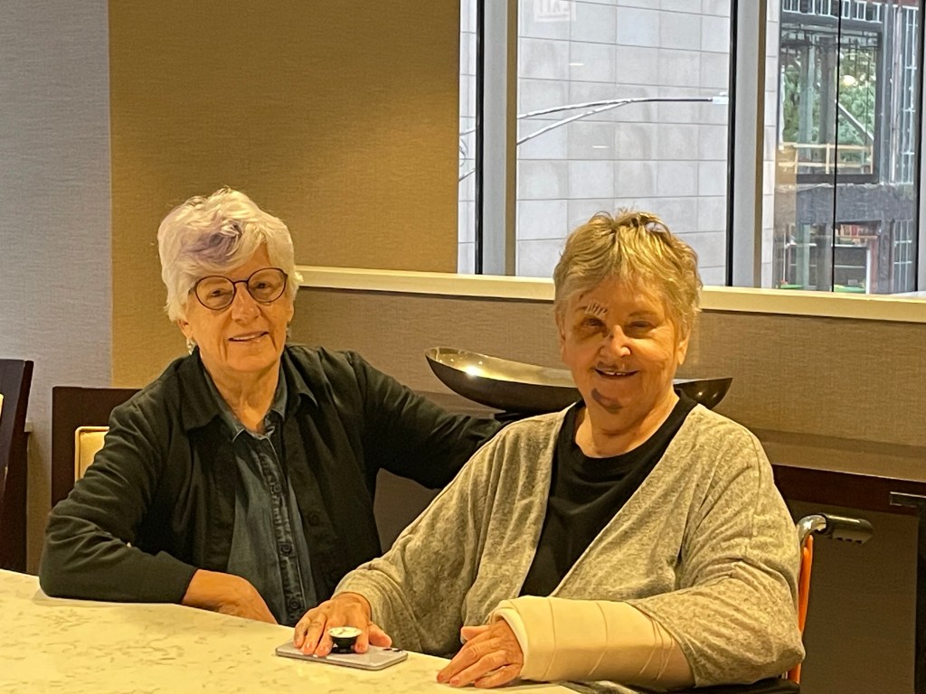 Lois came to Chicago to sell her books. Instead, she survived a devastating fall, was cooped up in a hotel room with pain, leaking ice packs, and poor internet reception. Over the three days we relived the accident. It still seemed surreal to us. Lois had no recollection of the fall. I had flashbacks of her sailing through the air and landing with a splat on the Chicago asphalt. Believe it or not, we laughed over many of the grim moments. Both nurses, we have an inbred sense of gallows humor. Selling one book didn’t cause complaint from Lois. Nor did either of us miss going on our planned excursions.
