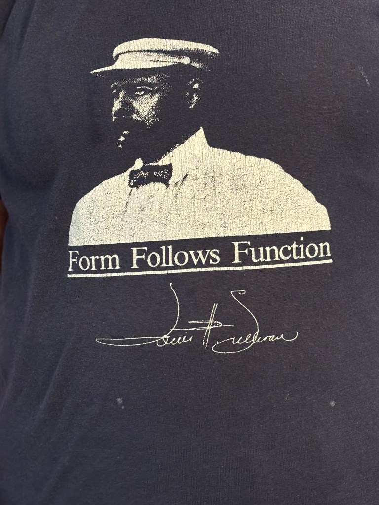 I’m wearing my favorite old T-shirt today. Although it’s dark navy, it’s comfortable in our current humid and hot North Carolina summer. A picture of Louis Sullivan, a Chicago architect, sits across my chest and under his picture is a script: Form Follows Function. I love the material. It’s gauzy but not too light. It’s 50% cotton and 50% polyester and Made in the USA (Clute, Texas). I don’t know how old this shirt is. I have had it since the 80s when I volunteered for the Frank Lloyd Wright Foundation in Oak Park, Illinois. Sullivan was a mentor to Frank. I learned a lot about architecture—so different from nursing. I would take my young daughter to the various FLW open houses. Wright designed the most homes in Oak Park. My daughter became an architect.