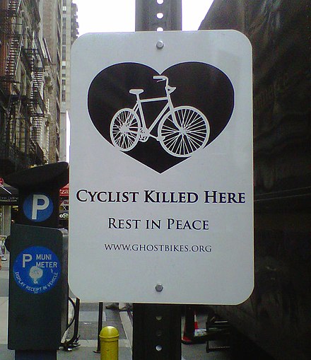 Ghost bikes, which originated in Amsterdam in the 1960s, serve as a memorial to a cyclist who was killed by a driver of a motor vehicle. The bikes are spray-painted white, anchored to something immovable, and rendered unrideable to reduce the incentive to steal them. Ghost bikes are an international phenomenon. (Wikipedia)
