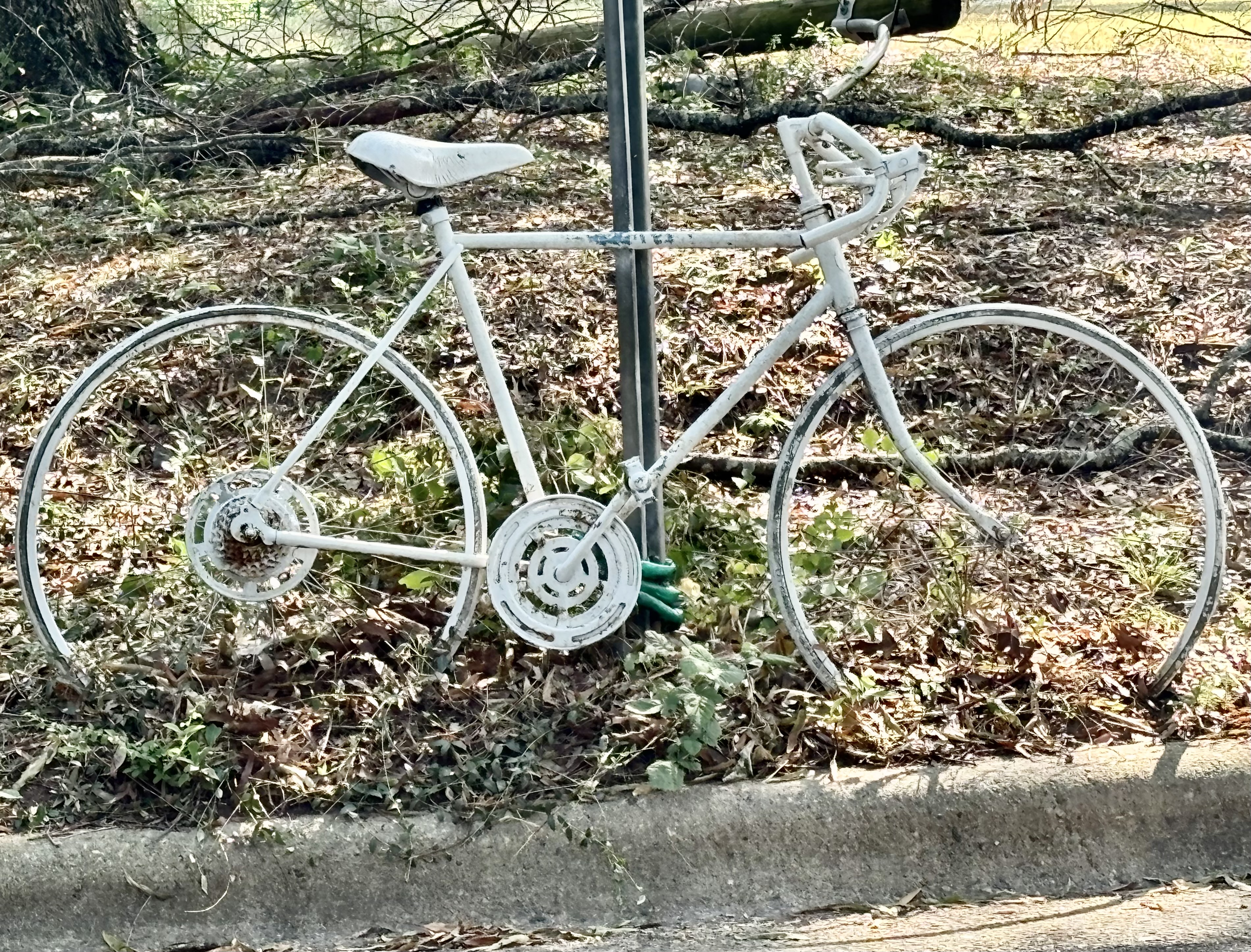 I stop my car on a two-way street and put on the flashers alerting the cars behind me to pull around. Rolling down the driver’s side window I focus my I-phone camera on the white bike across the street. In between the cars and bikers who pass me, I take a picture of the bike.